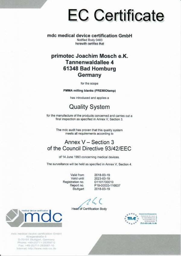 PREMIOtemp blanks are made of high quality PMMA (Polymethylmetacrylate), with cross-linking agents added to optimize the network structure of the material.