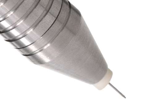 Das Handstück wurde neu konzipiert und kann nun noch schneller reagieren. Dadurch sind etwaige Schwankungen im Schweißpunktdurchmesser nahezu ausgeschlossen und die Gefahr des Anhaftens der Elektrode an das Werkstück ist stark reduziert. Weiterhin wurde die Handstückdüse mit einem Keramikeinsatz versehen. Dadurch wird das Argongas noch genauer auf die Schweißstelle geführt und die Gasdurchflussmenge auf nur noch ca. 2 Liter/Minute reduziert.