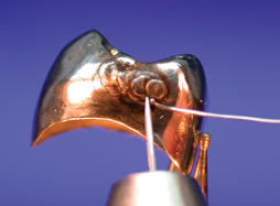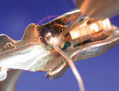 Diese Gefahr ist durch die spezielle Pulsform mit HF-Überlagerung der voreingestellten phaser-Programme für diese Legierungs-typen weitgehend gebannt. Soll allerdings bei der Schweißaufgabe Material zugeführt werden, ist darauf zu achten, dass bei Palladium-Silber Legierungen immer hochgoldhaltiger Zulegedraht verwendet wird. Bei Kobalt-Chrom Legierungen muss der Draht zwingend kohlenstofffrei sein.