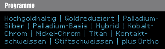 Die 13 voreingestellten Programme der phaser Geräte decken alle gängigen Legierungstypen und Schweißsituationen im dentalen Bereich ab. Legierungen die bisher als „schwierig zu schweißen" galten, wie z.B. Palladium-Silber sind optimal vorprogrammiert und stellen kein Problem mehr dar. 7 weitere freie Programmspeicherplätze können individuell belegt werden.