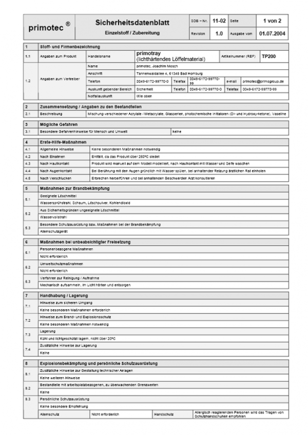 Hier liegt für Ihre QM-Unterlagen das Sicherheitsdatenblatt zu primotray bereit