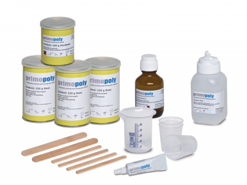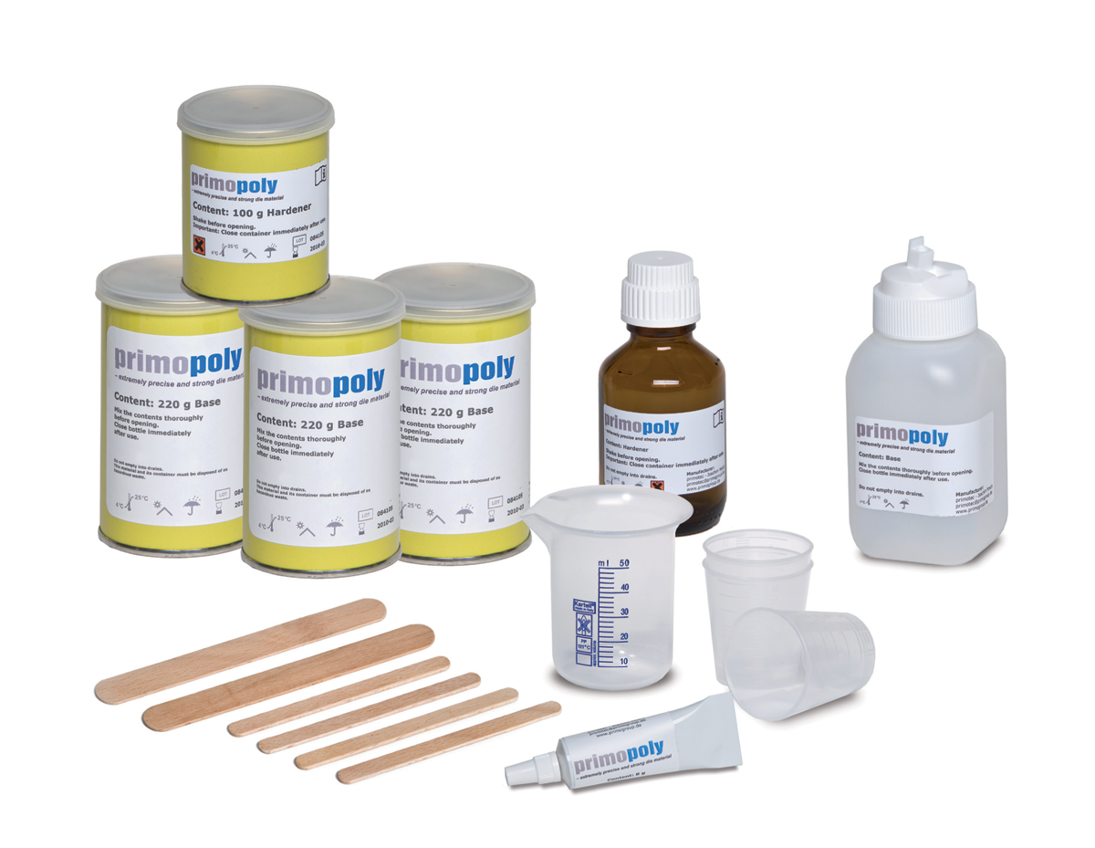 Primopoly is a polyurethane die material. In general polyurethane is the most accurate, strongest and cleanest die material on the market; much more so than traditional die stone and epoxy.